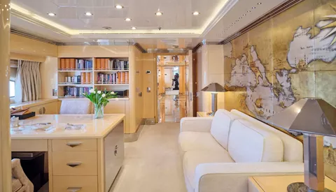 1 x Master Suite with owner's study, king size bed (his and her bathrooms) and full beam sitting area, located on the main deck.