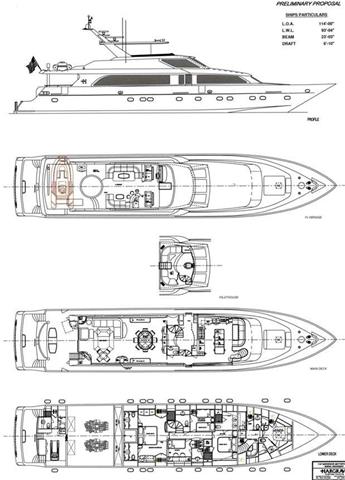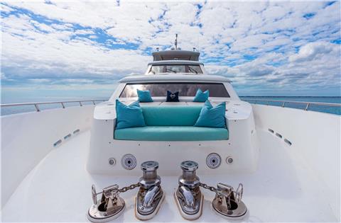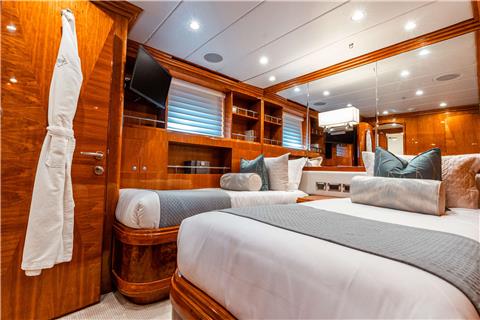 Below deck are four sumptuous staterooms including a full-beam master with high-gloss cherry woodwork trimmed in gloss camphor burl, light fabrics, and a his and her en suite bathroom with light marble inlays and a walk-through shower/tub.