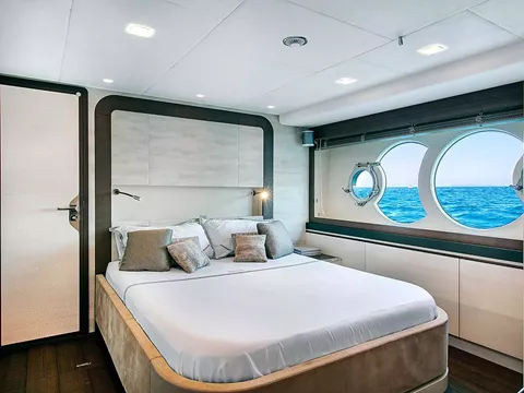 engines offer low fuel consumption whilst the specialist onboard water treatment system minimises the effects on marine life. Organic and ecological products used on board further protects the oceans that she cruises.