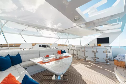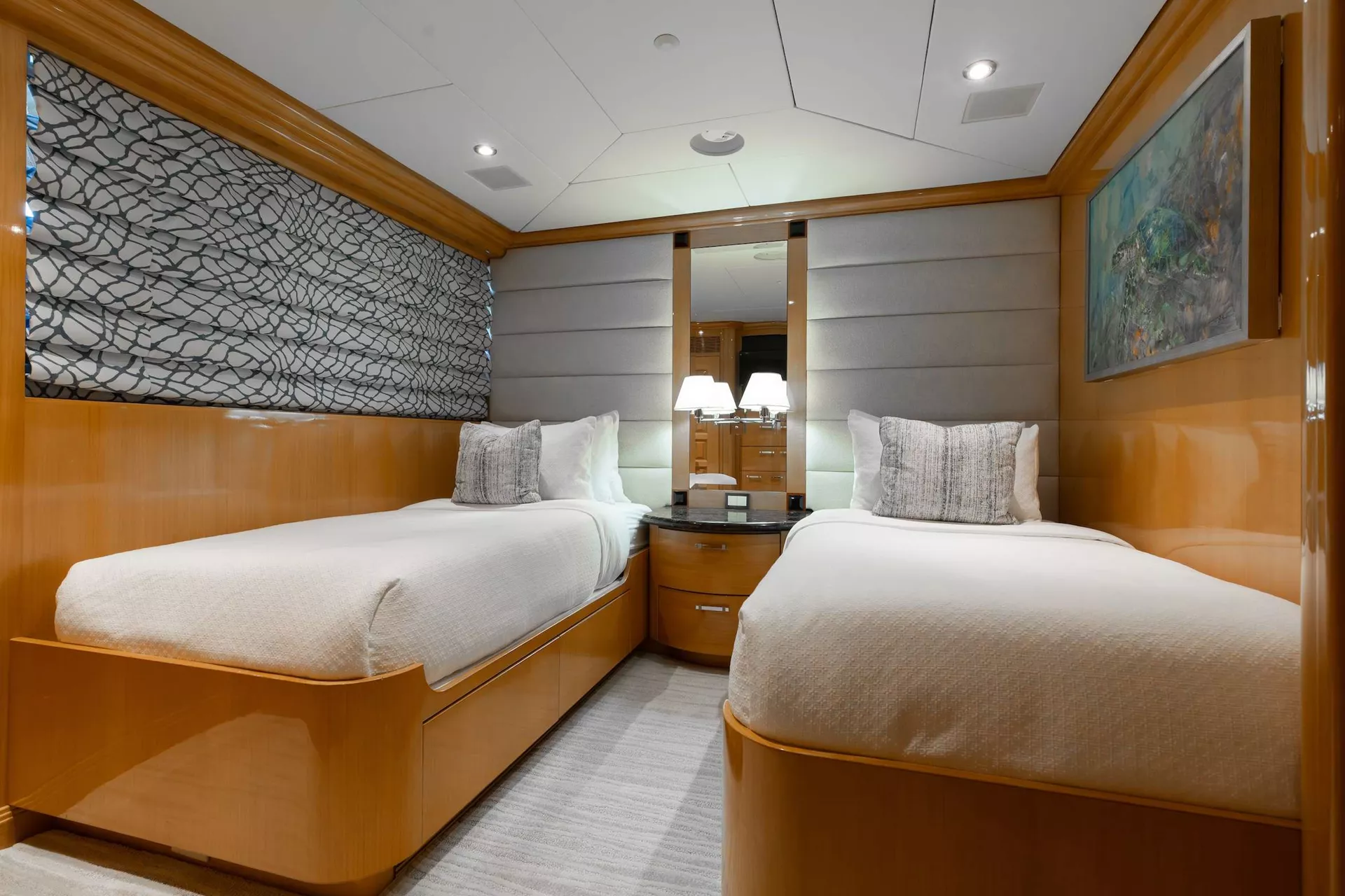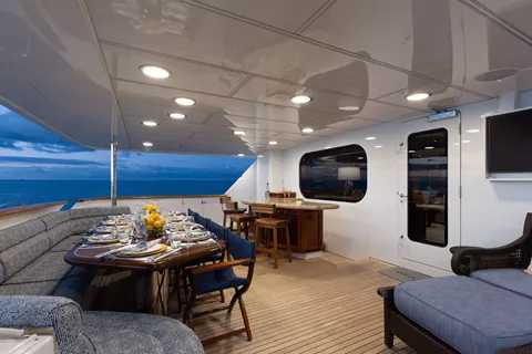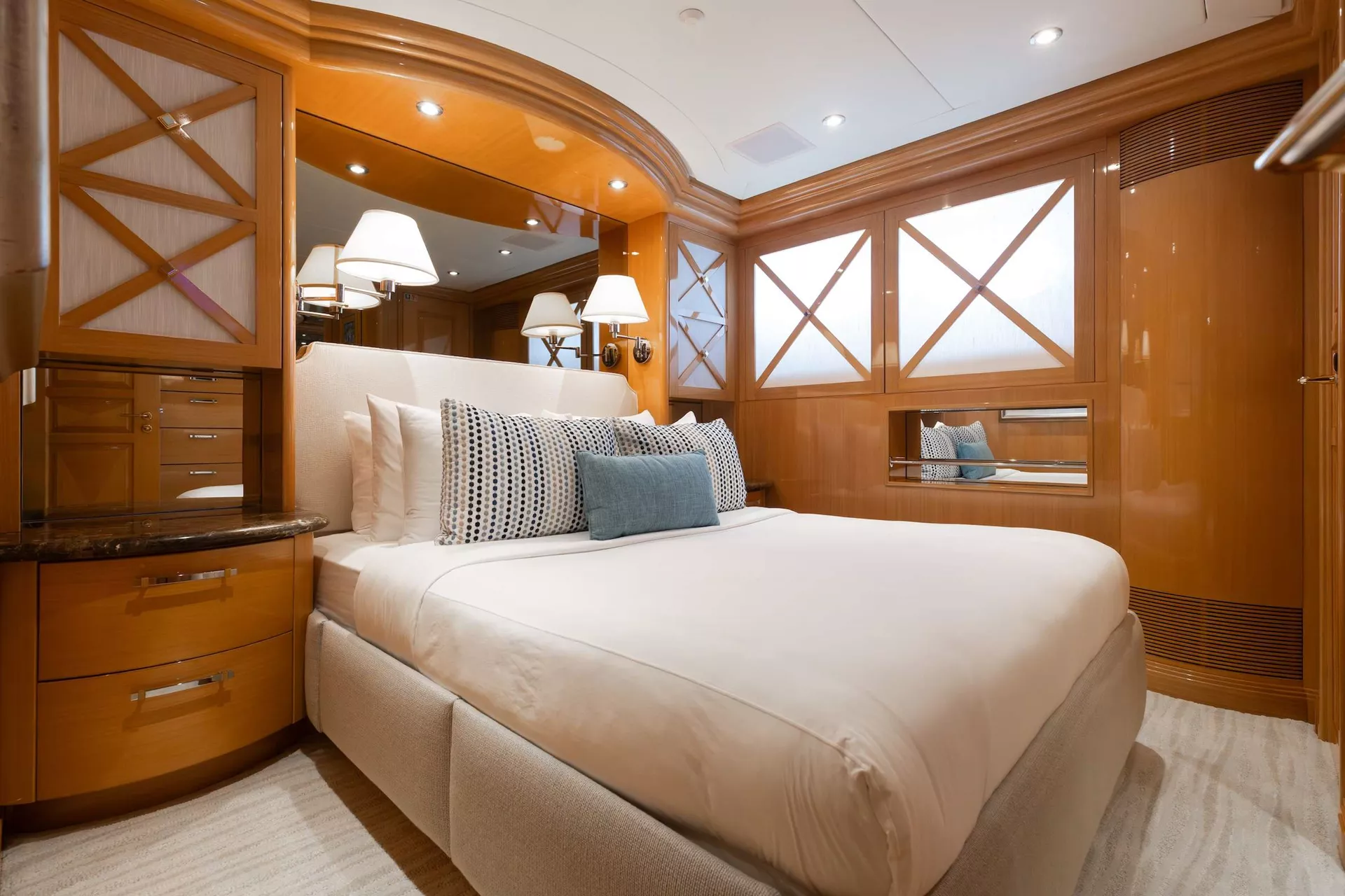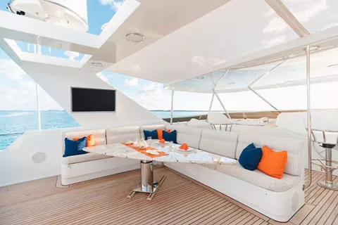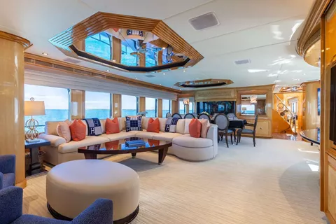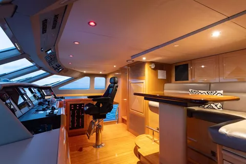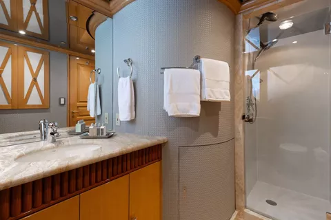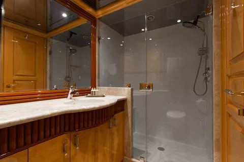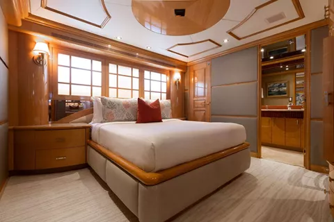 Below deck, four well-appointed guest staterooms provide flexible accommodations, including two VIP queen staterooms aft to port and starboard. Forward is an additional queen stateroom, along with a twin stateroom. All guest accommodations offer private en-suite baths, ensuring a refined and comfortable experience throughout.