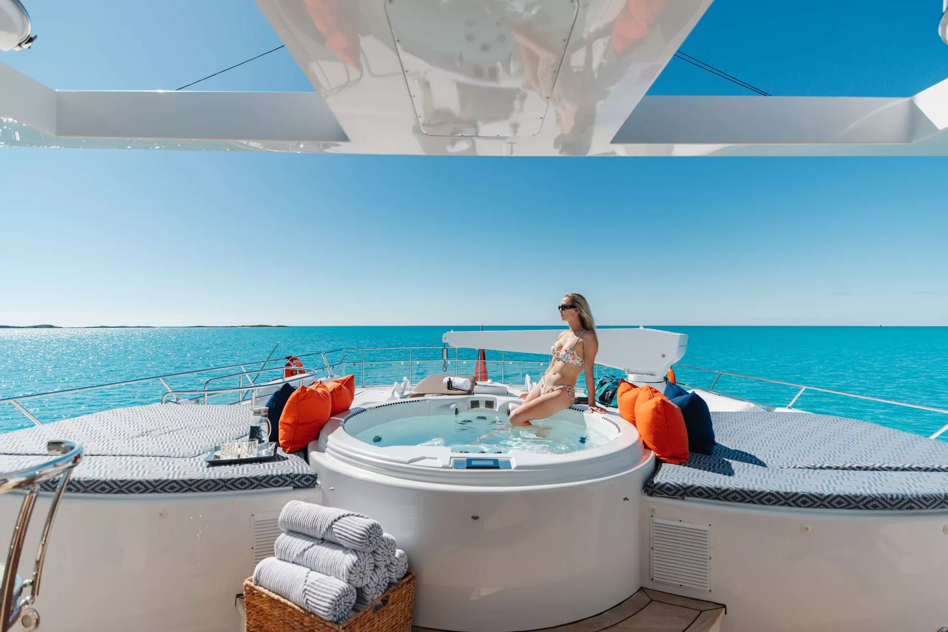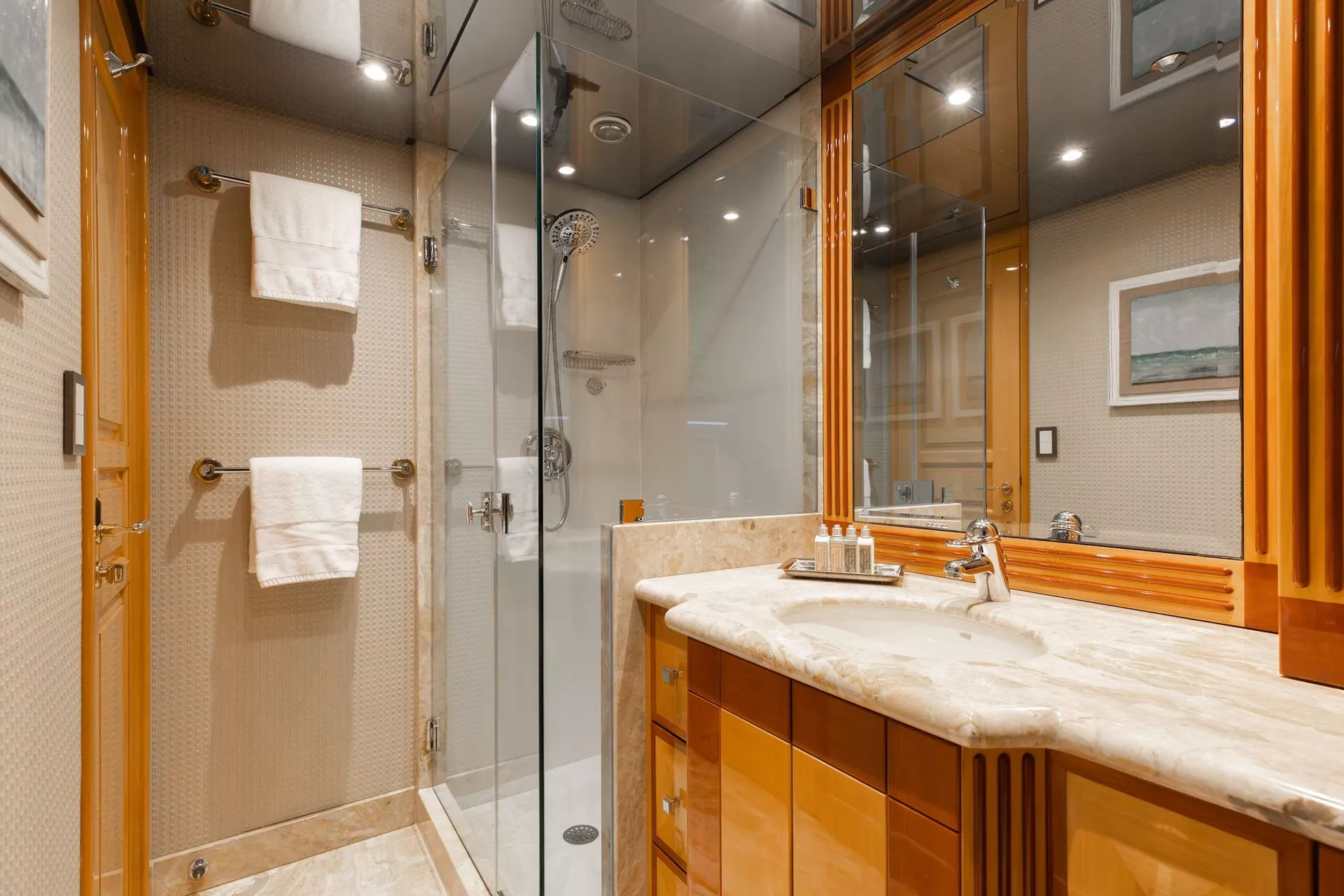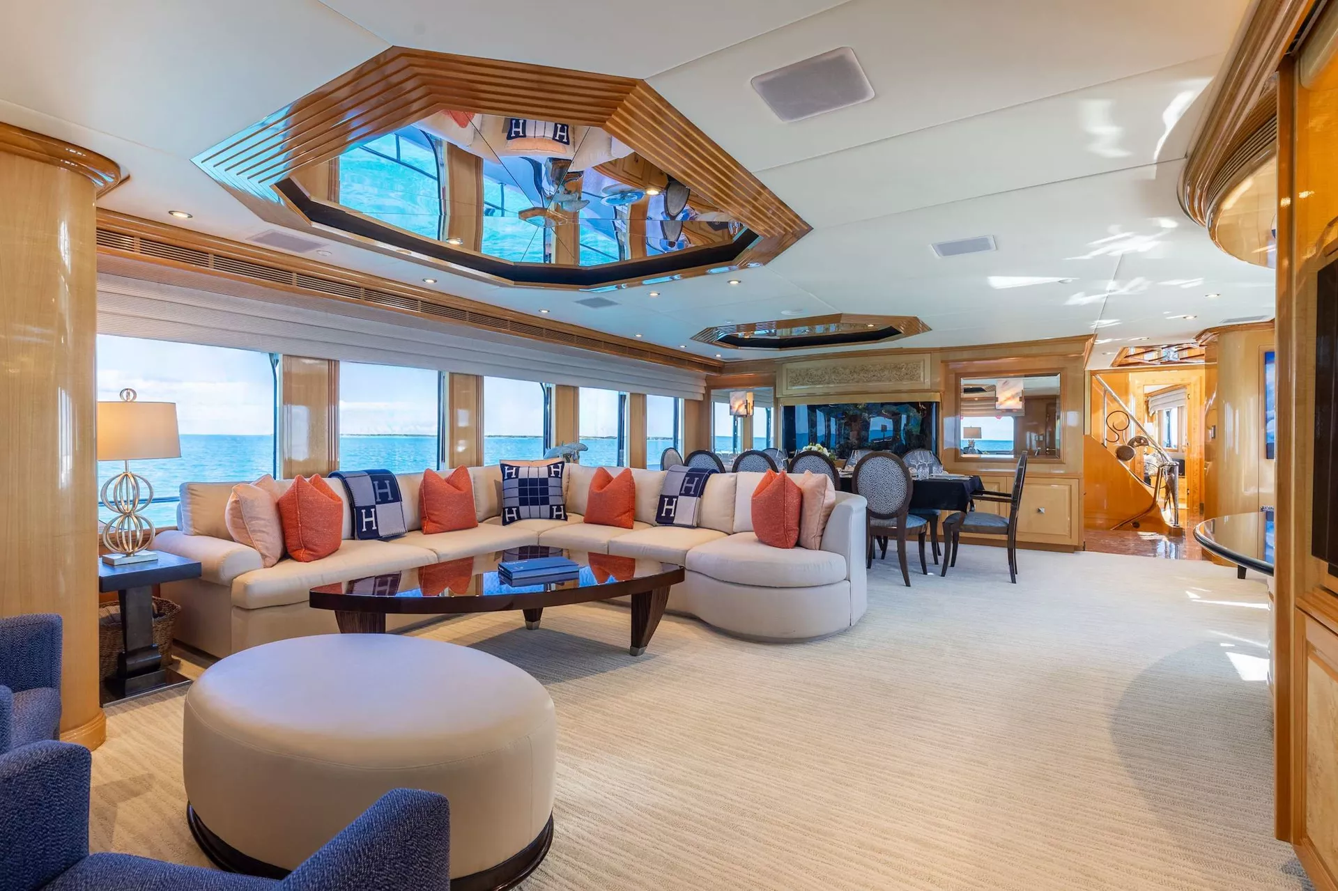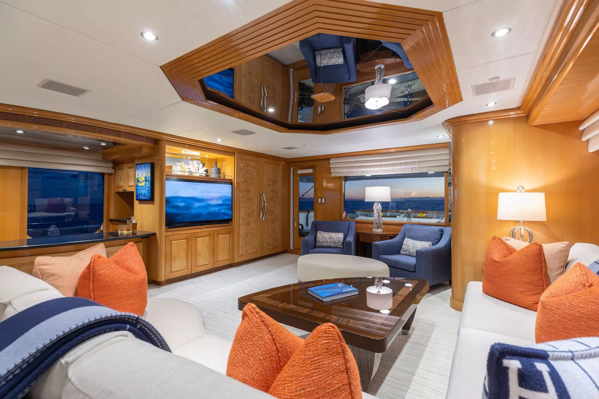 Below deck, four well-appointed guest staterooms provide flexible accommodations, including two VIP queen staterooms aft to port and starboard. Forward is an additional queen stateroom, along with a twin stateroom. All guest accommodations offer private en-suite baths, ensuring a refined and comfortable experience throughout.
