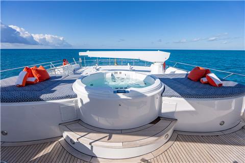This is the third charter yacht REFLECTIONS for her proud owners. They began yachting with an 85' Pacific Mariner, then a 107' Christensen and are now happy to be offering the five stateroom, 124' Christensen for charter. They love Bahamas cruising and are currently outfitting REFLECTIONS with a new updated interior, full list of water toys, towed tender and of course a proven, experienced charter crew. The space on board this 124’ yacht is immediately felt in her width and her layout. REFLECTIONS aft deck dining and lowered bar area offer space for the entire group. Entering the main salon, you are greeted by a cheerful fish aquarium, spacious, comfortable salon with bar and formal dining. Moving forward on deck, enter the master stateroom with king bed and his and hers open master bathroom including a shower and Jacuzzi tub with plenty of natural light. Below are four additional staterooms, all with en-suite bathrooms and comfortable amenities for guests. There are three queens for couples and a room with twin beds as well. Upstairs on the fly bridge, be treated to a highly customized deck area and the most popular spot on board. REFLECTIONS expansive fly bridge offers three captain’s chairs, a full dining area, bar, BBQ grill, huge Jacuzzi and sun pads, a hammock for the ultimate relaxation, sun lounges aft when the toys are in the water and all with the choice of shade or sun. Come enjoy all the Bahamas and REFLECTIONS have to offer!