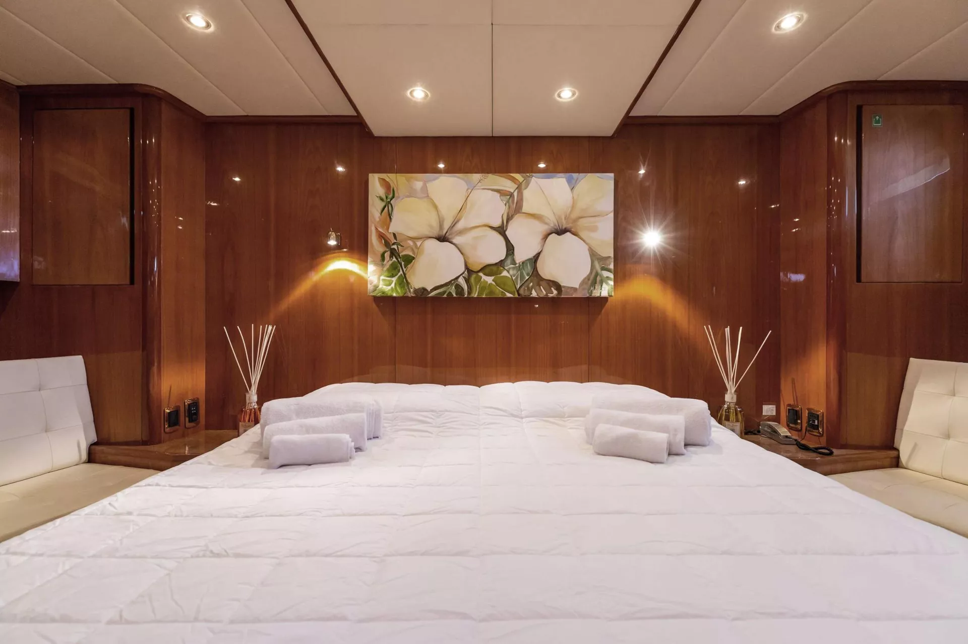 Access from the main deck goes through a beautiful outdoor dining area, and then continues into the main salon with a lounge area including sofas and a TV and, further, a separate indoor dining area. The kitchen is really wide for a yacht of her size and allows the crew to prepare elaborate culinary creations and to perfectly manage the refreshments service.