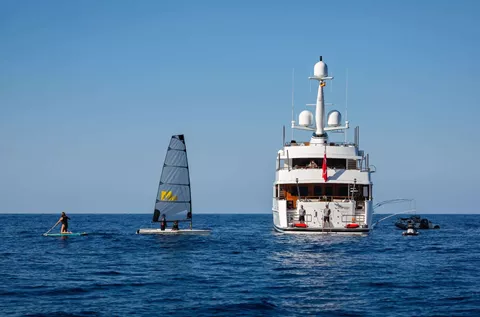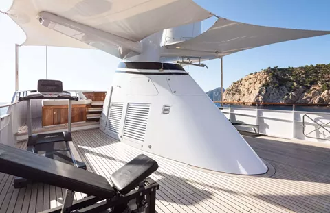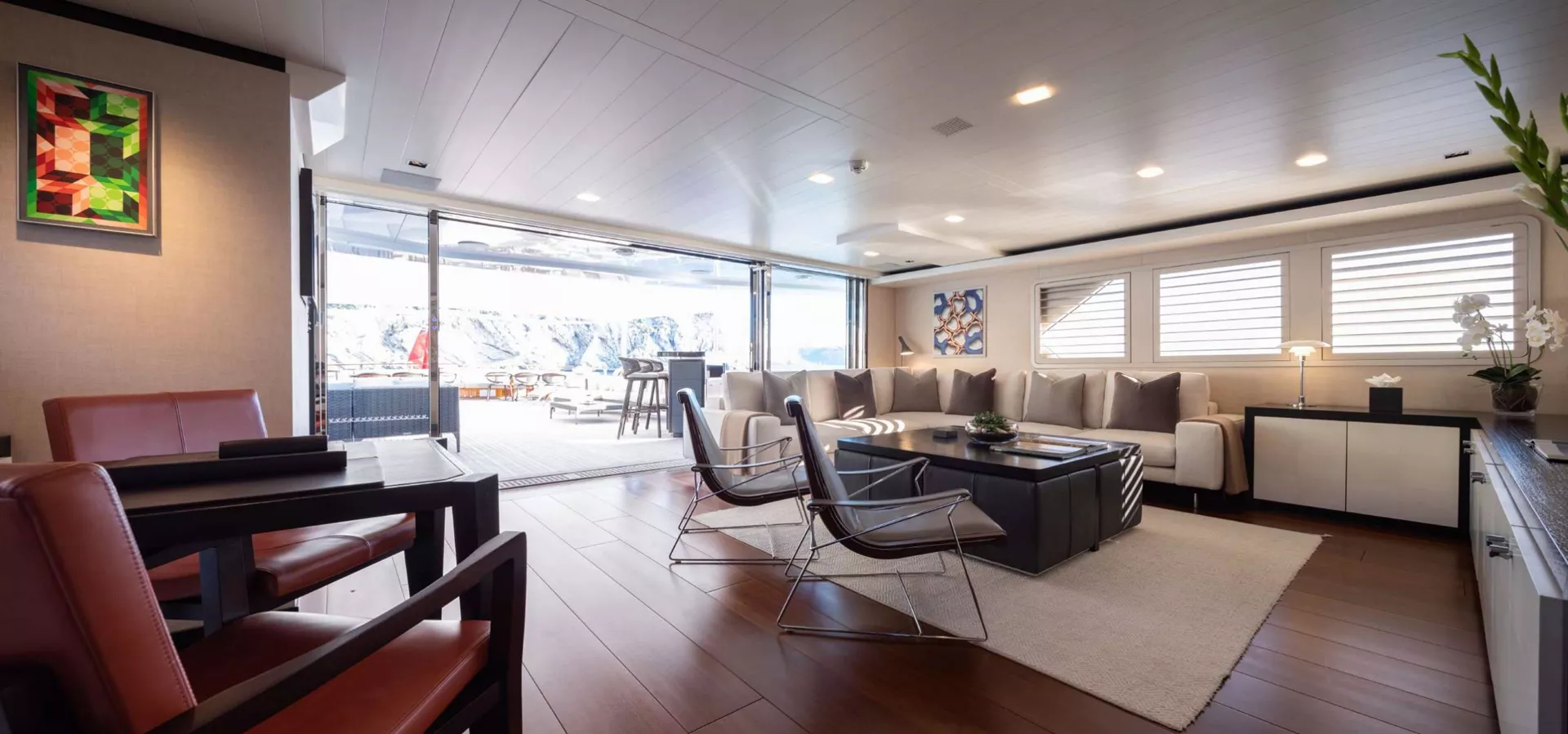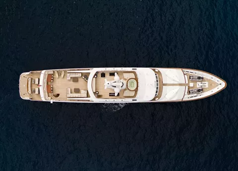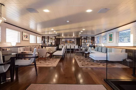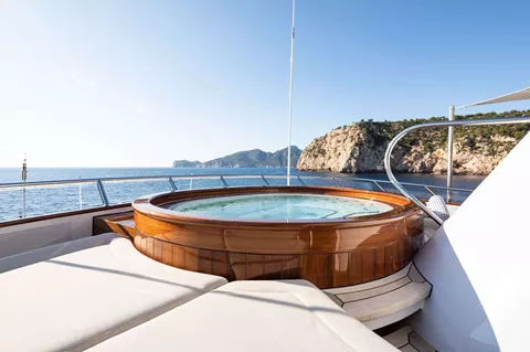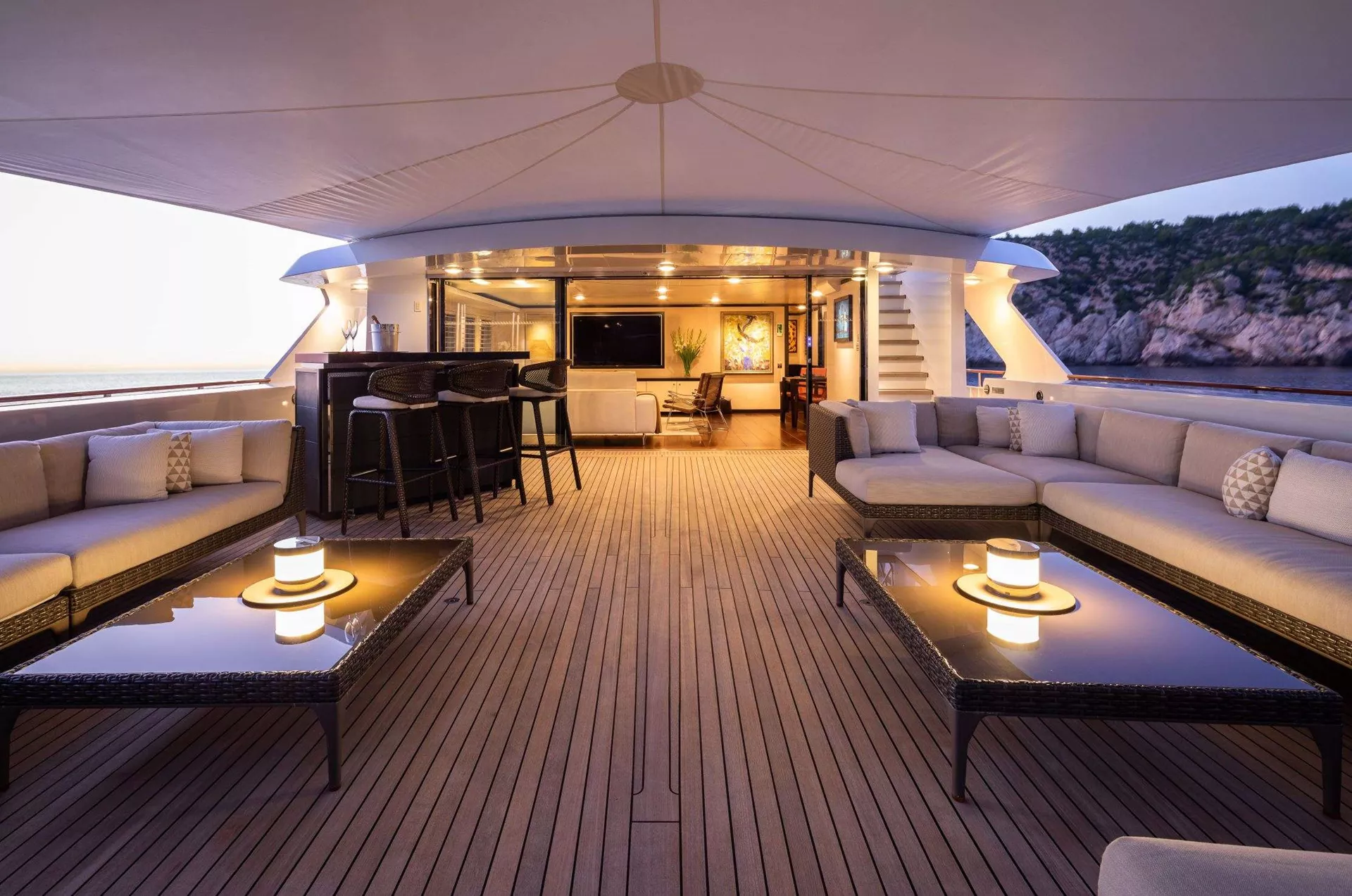 The recently refitted MIRAGE superbly combines open and covered deck space with great internal volume. There are 8 cabins available including a Master and VIP on the main deck, 2 double cabins and 4 twin cabins on the lower deck. Her spacious living areas are designed with teak, subtle cream fabrics and contemporary furnishings. Her outstanding sun deck, with large dining area, huge sofas, and her vast main aft deck area, ensures outdoor living at its best.