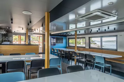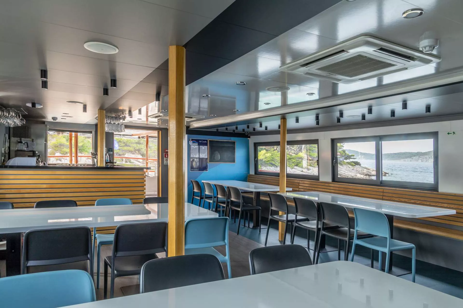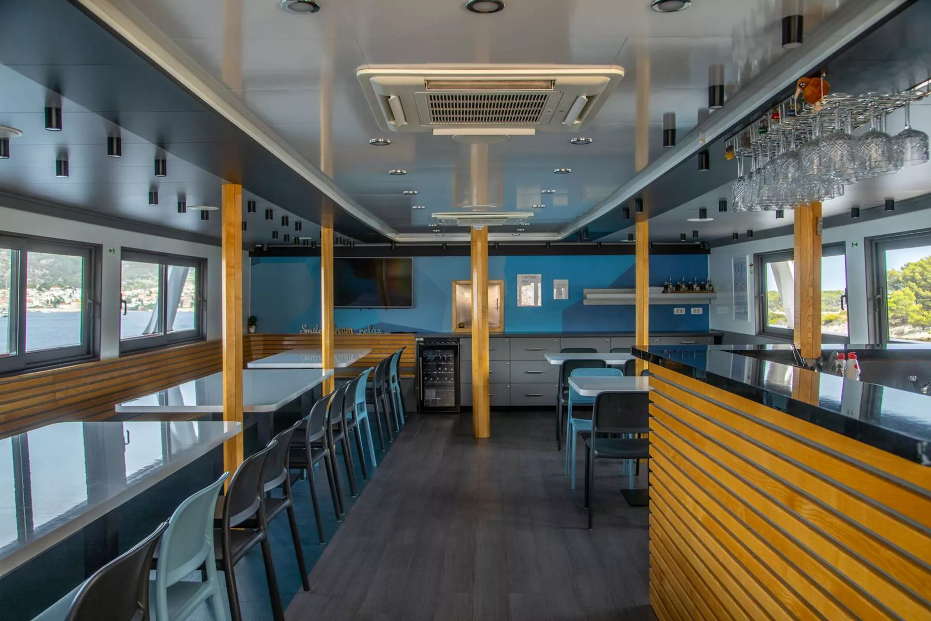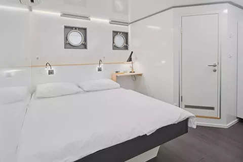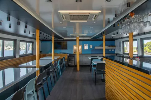 M/Y Almissa is luxurious mini-cruiser custom built in 2017. 40m in length with beam of 8 meters she can accommodate up to 40 guests in her minimalistic & modern en-suite cabins. There are 19 cabins of which 2 are triple, 7 are double and 10 are twin cabins. Each cabin has private shower and toilet facilities. There are two common toilets on the yacht. Air-conditioning is available 24/7 in cabins and saloon area.