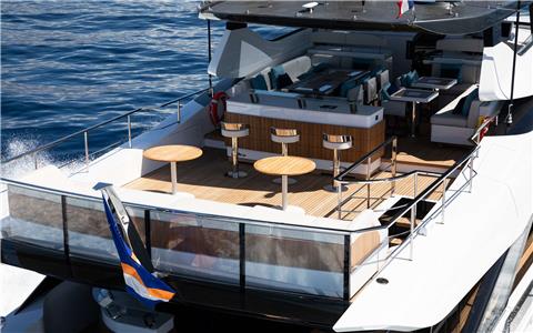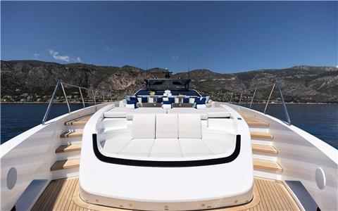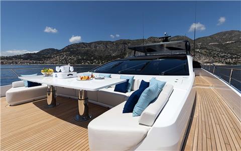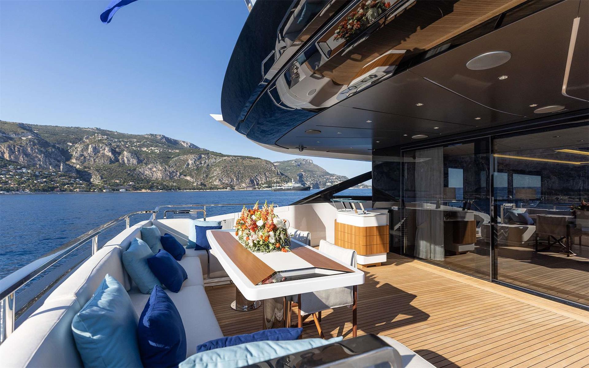 Floor to ceiling windows and doors surround the main deck salon allowing guests to feel as if they are outside while protected indoors when needed. The formal dining seats 8 guests while the aft and flybridge dining, in true al fresco style will seat more, especially lending shade cover overhead as well. In addition to the lounge area on the flybrdge aft combined with high top bar, guests have an equally as large al fresco dining, sunning and Jacuzzi area forward with shade option.