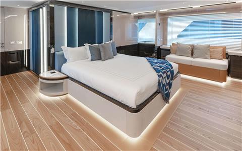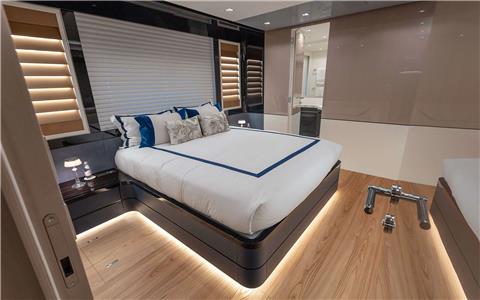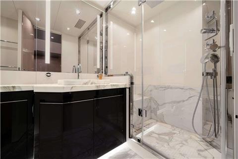 On deck Master Stateroom forward with a large walk in shower with steam feature. Long concealed hanging closets for guests.