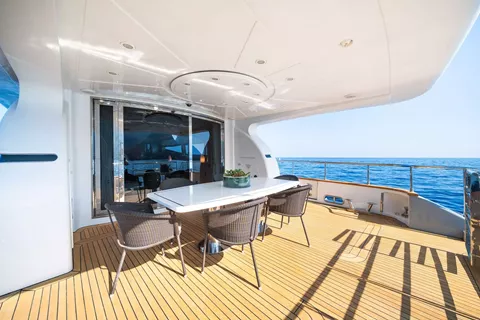 Stepping onboard COCA VI, you will first discover her aft deck, with a new lacquered white table for 8 guests. This aft deck looks very glamorous and is always remarked upon by passers-by when the yacht is in the harbour. Upon entering the yacht, you will discover a vast saloon with 2 silver sofas, a dining area made with a transparent table and chairs and a surprising decoration. You will never believe that this yacht was built in 2000!
