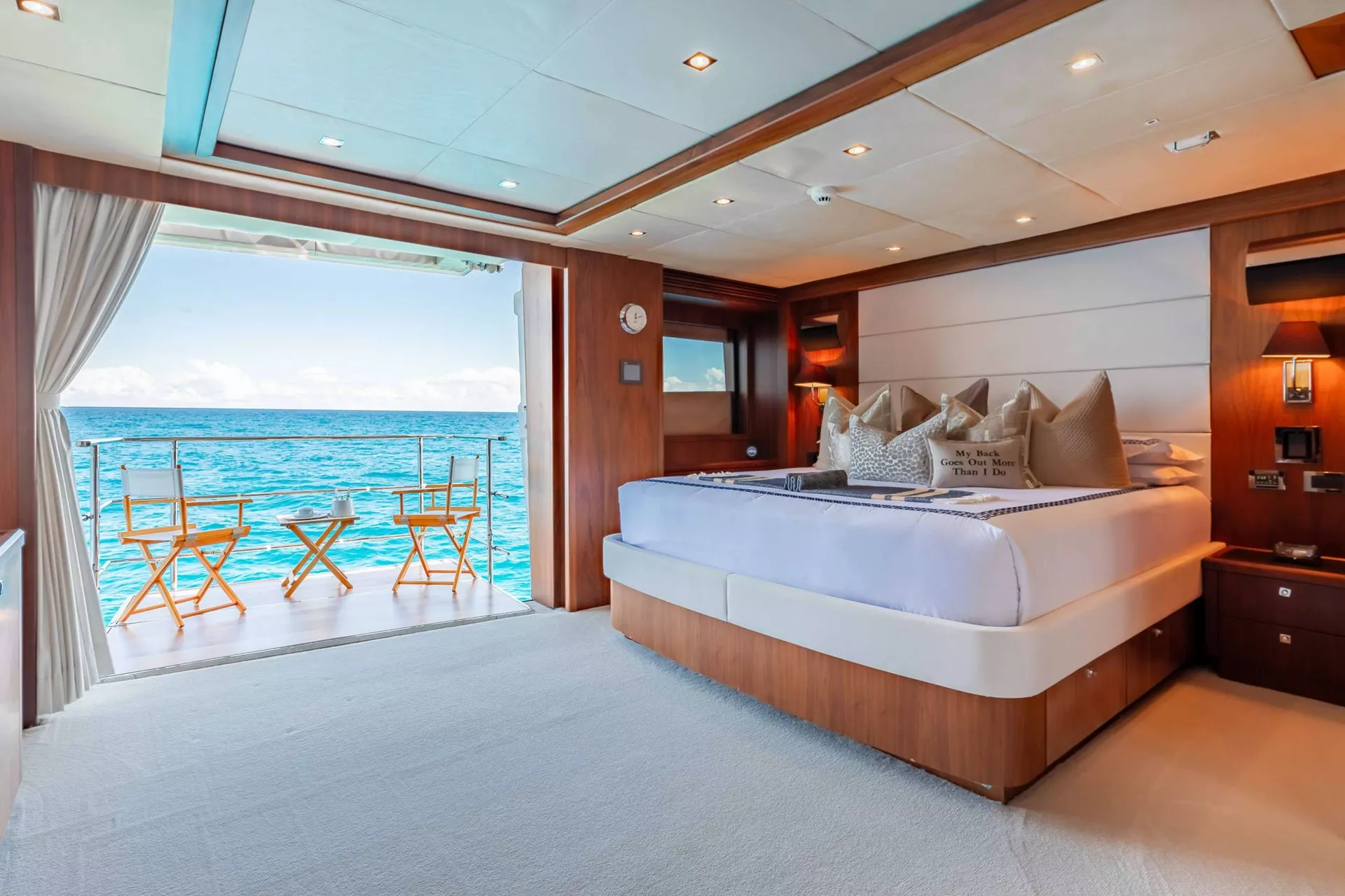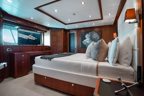 1 X MASTER CABIN AND ENSUITE on the main deck forward. King island bed, cinemas surround sound with B&O 50 inch flat screen, Sat TV, Apple TV, and BOSE lifestyle DVD /Stereo. Study and writing desk, 2 x single seats with coffee table. Port side fold-out balcony. Timber walls, beige carpet, digital safe, electronic touchpad lighting, walk inrobe, dressing mirror, eye-level windows for a great exterior view and natural light.