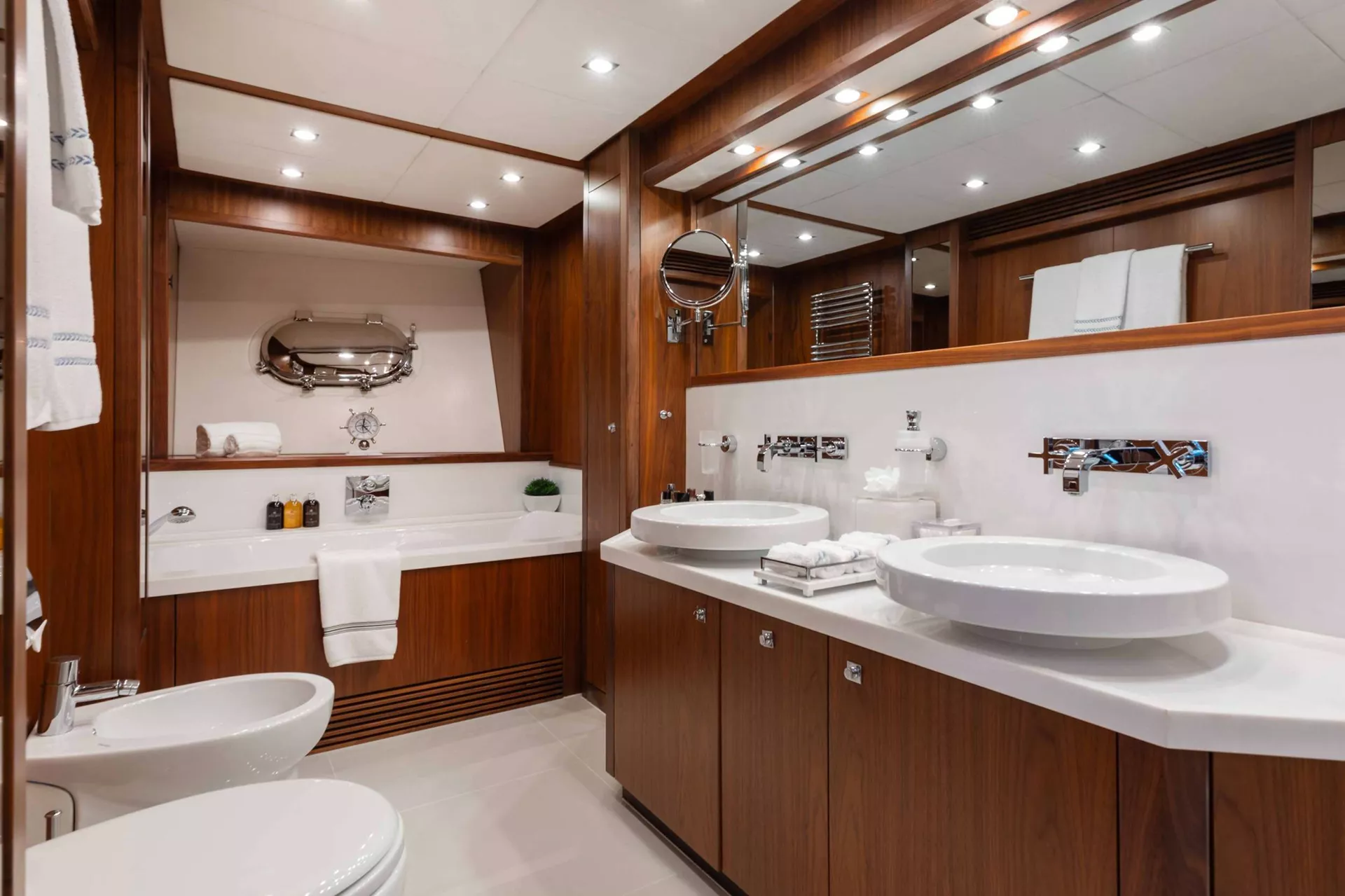 Master bathroom with twin sinks, marble tops, massage shower with bench seat, jacuzzi, and twin port holes. Techma toilet and Bidet, towel warmers, vanity mirrors, drawers, and cupboards.