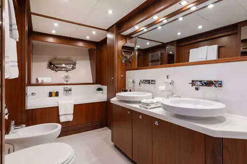 Guest cabins x 5 – Techma heads, single sink with vanity mirror and cupboards, towel rail and robe hooks, massage shower, marble floor tiles, port hole, timber blinds, and wall panels. The Twin VIP cabin ensuites have his and her wash basins and bidet.