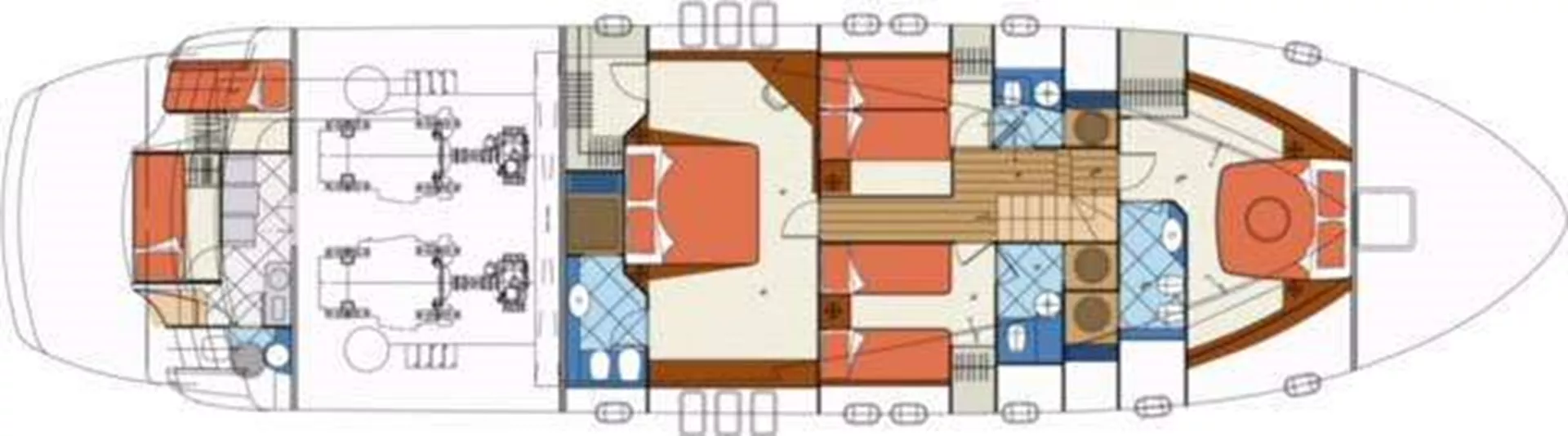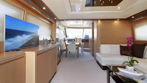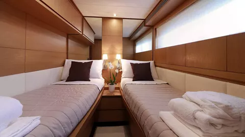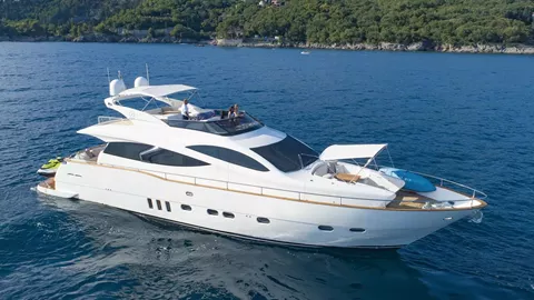 Accommodating up to 8 persons in four cabins, she provides ulterior comfort while allowing for some flexibility. Two spacious cabins are doubles, and the other two are twins, but one can be converted to a double. Her common spaces invite gatherings: the flybridge features an al fresco dining table but can be converted into a large sunbathing area; the saloon has an upgraded entertainment system and the aft deck with a dining table simply calls for sunlit dinners. Hop into the turquoise Adriatic Sea from the large bathing platform with shower, and marvel at the breathtaking vistas from the lounge area on the bow, complete with a sun tent.