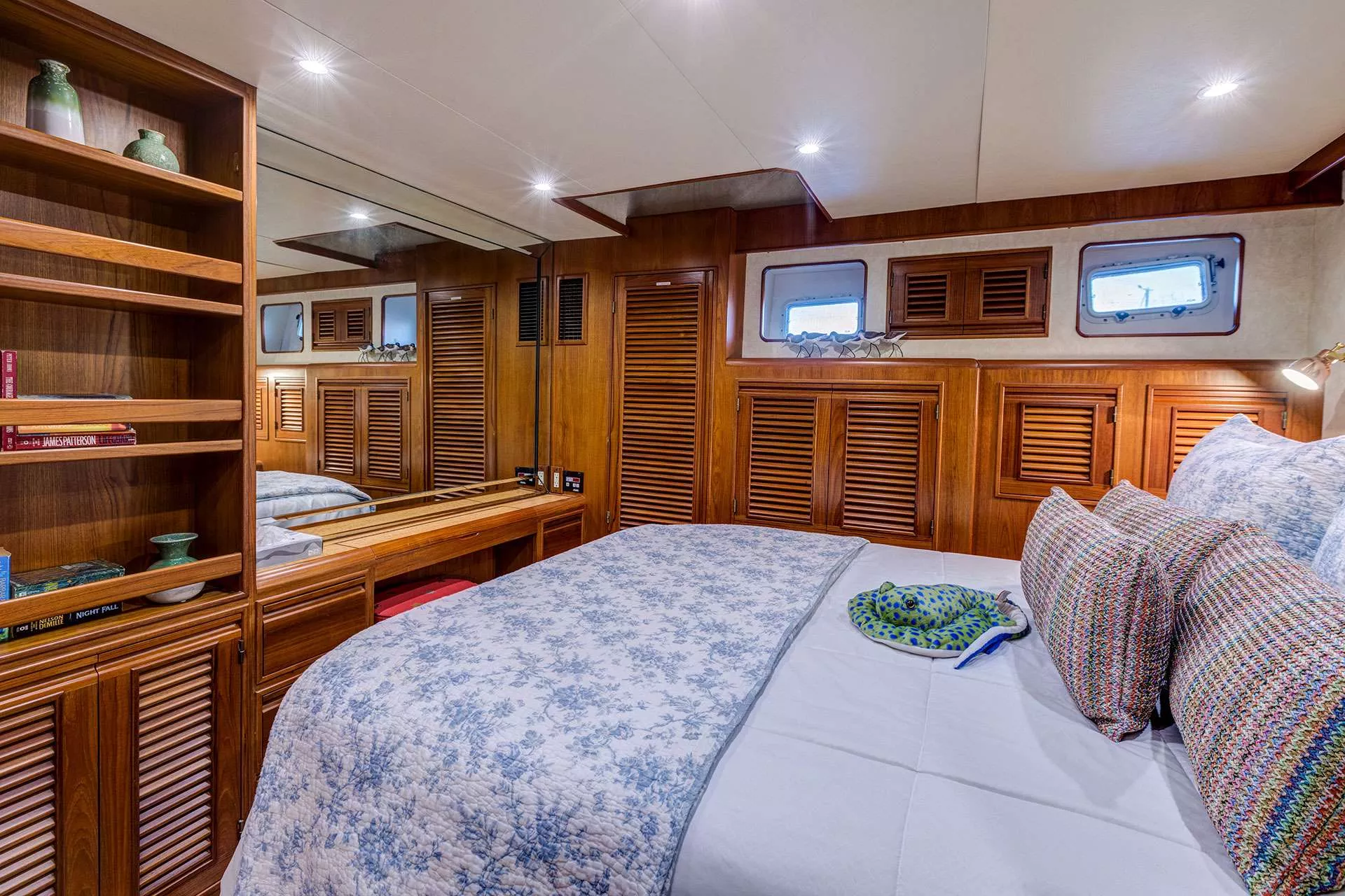 The Double Upper/Lower berth cabin sports 1 large hanging locker and dresser with standing head room and access to head and shower via companionway (shared with the VIP Queen cabin).