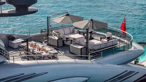 The iconic 218' OKTO is a masterpiece of maritime engineering and design that effortlessly blends cutting-edge technology with timeless elegance. She has exceptional noise and vibration proofing plus economical fuel consumption with a max speed of 18 knots. This sophisticated superyacht boasts a 20-foot infinity-edged, contraflow current swimming pool, surrounded by loungers that create a private beach club experience. The pool seamlessly connects to the main salon through retractable floor-to-ceiling glass doors, where the circular dining table for 12 guests offers superb views. The stateroom arrangement on board ensures that all guests feel truly privileged. The main deck primary suite features a king bed, private lobby, large bathroom, and a retractable private balcony. Complementing this is an on-deck VIP suite complete with stunning views and opulent linens. The lower deck presents a further four queen suites, accommodating 12 guests in a total of 6 staterooms.
