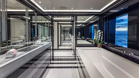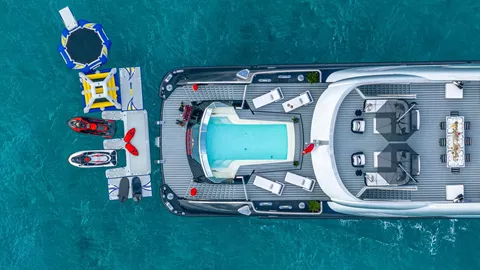 Prioritizing convenience and comfort, an elevator graces this four-decked marvel, enhancing accessibility from the lower guest areas to the bridge deck. Ascending to the upper deck, a circular cinema room transforms the high seas into a silver-screen haven—an ideal retreat for cozying up after a day of maritime adventures. For those with a penchant for activity, an indoor gym occupies the prime spot beside the Jacuzzi, offering panoramic views. This space stands as one of the most magnificent places to break a sweat on any superyacht, emphasizing the vessel's commitment to those who revel in doing so. This yacht caters to enthusiasts, evident in its extensive array of water toys tailored for active charter clients. 3 tenders accompany an impressive lineup that includes jet skis, sea bobs, wake skates, kneeboards, e-Foils, electric surfboards, and wakeboards and much more. Her professional charter crew will ensure every detail of your experience is unforgettable.