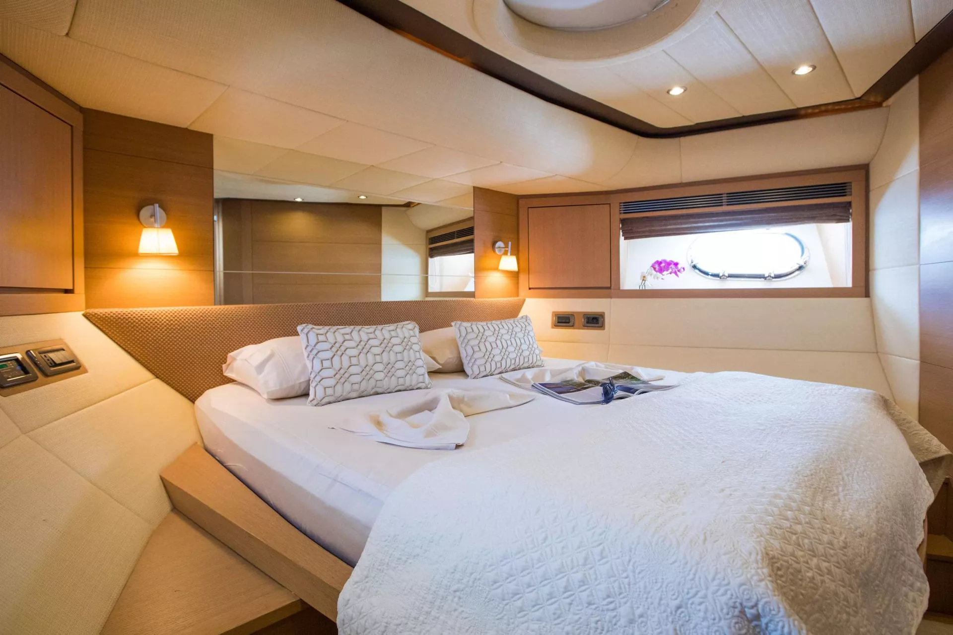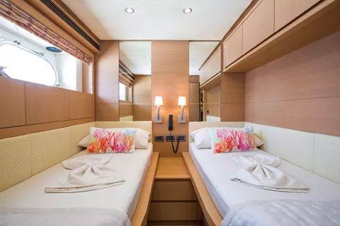 Guests are accommodated in 4 En Suite cabins; Master Cabin en suite with shower (bed dimensions 180x190cm), VIP Cabin en suite with shower (bed dimensions 160x190cm), Guest Double bed Cabin ensuite with shower (bed dimensions 140x190cm), Guest Twin bed Cabin en suite with shower (bed dimensions ; each 75x190cm) .