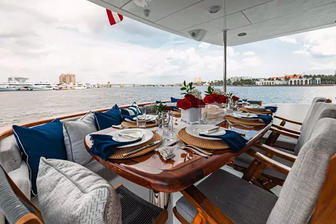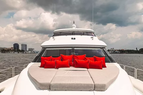 An extended hydraulic swim platform, 76 inch tall ceilings and Naiad stabilizers complete INDY's impressive charter profile, with a professional crew ready to cater to your needs at a moment's notice