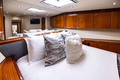 Welcome aboard INDY, where elegant styling, luxurious accommodations, and impressive performance await you. Fresh from a 2023 refit by acclaimed interior designer Patrick Knowles, INDY seamlessly blends luxury and comfort, making it the perfect charter choice. With a cruising speed of 19 knots and a top speed of 25 knots, INDY promises swift and stylish journeys. Its 21.3-foot beam, comparable to that of most 90-foot yachts, offering expansive space, while the solid fiberglass hull ensures exceptional strength and durability. INDY accommodates eight guests in four spacious cabins, along with a crew of four.