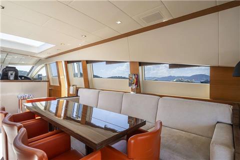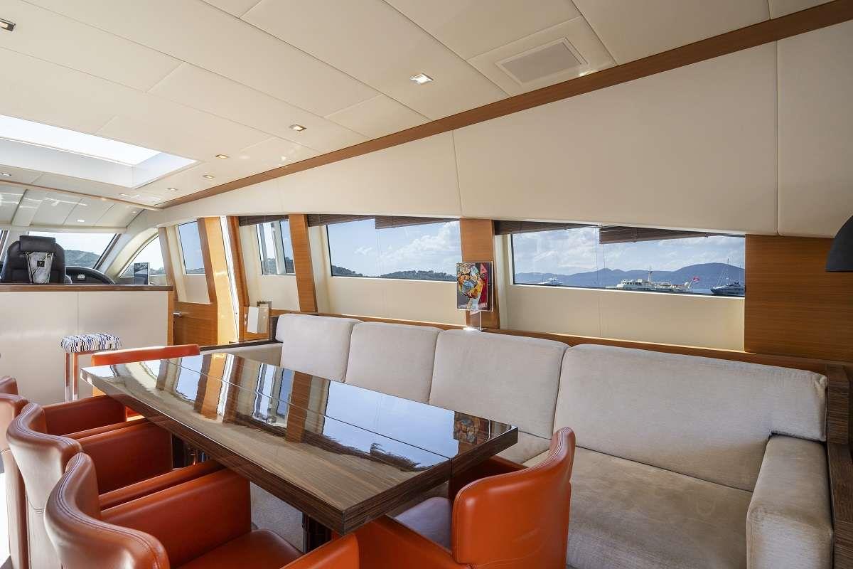 Step into her luxurious interior living spaces, adorned with dark wood floors, medium-toned wood panels, and crisp white linings, seamlessly complementing the neutral soft furnishings. The spacious saloon boasts a generous layout, featuring two large sofas, complete entertainment systems, and an abundance of natural light streaming through elongated side windows. A wide sliding glass door effortlessly connects the saloon to the aft deck, creating a versatile and inviting socializing area for any occasion.
