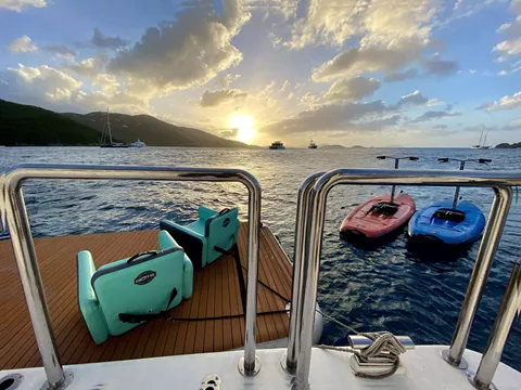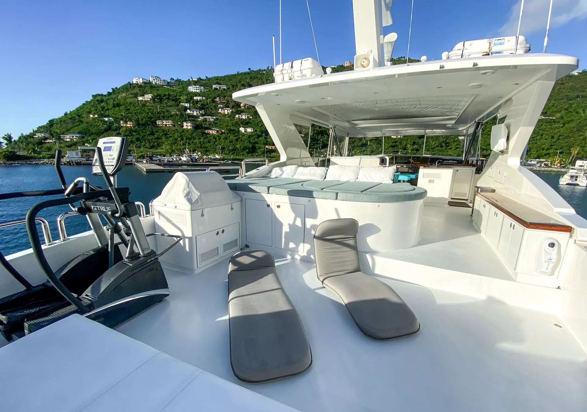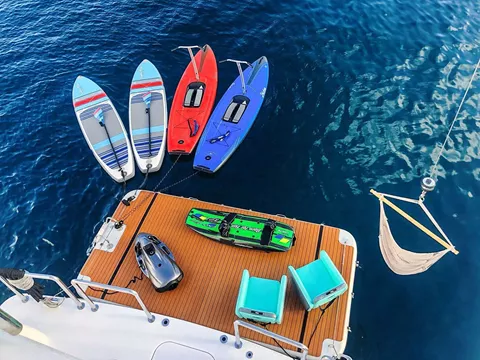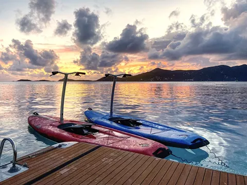 CynderElla is equipped with an array of modern amenities to ensure guests enjoy every moment on board, such as Starlink satellite communications, on board WiFi, air conditioning, gym equipment and an on-deck Jacuzzi. Her gym equipment is complete with an elliptical exercise machine, yoga mats, Hobie Elliptical SUPS, free weight dumbbells and workout resistance bands.