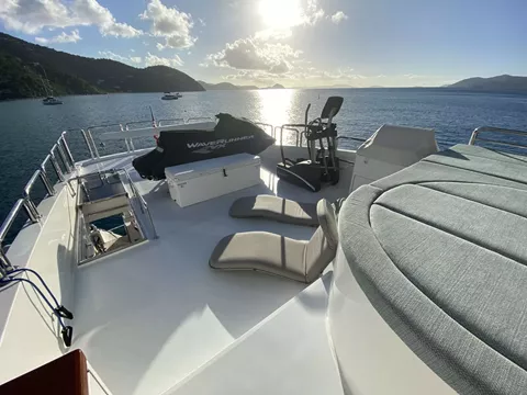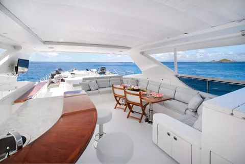 CynderElla's exterior is also designed by Hargrave. The expansive flybridge is a highlight, offering a large U-shaped seating area, a teak-topped bar with seating for four, and plenty of open space for al fresco dining. Guests can relax on sun pads next to the Jacuzzi, creating the perfect spot to unwind after a day of water activities.