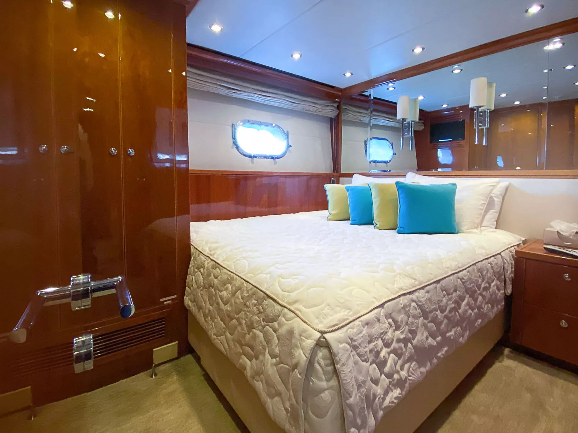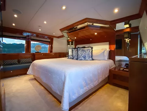 CynderElla can accommodate eight guests across four well-appointed cabins. She has a unique layout, with two master suites. One of her master suites is positioned on the main deck, and features a king-sized bed. The second master suite is full-beam and is located on the lower deck, also with a king-sized bed.