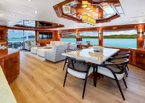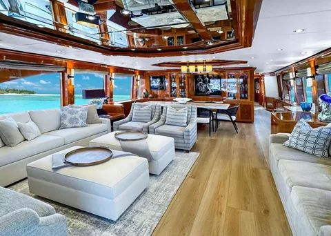 The interior of CynderElla was designed by the renowned American design house Hargrave, offering a sophisticated and comfortable space for relaxation and entertainment. The main salon provides a spacious area for socialising, while elegant finishes and modern amenities create a truly luxurious on board experience.