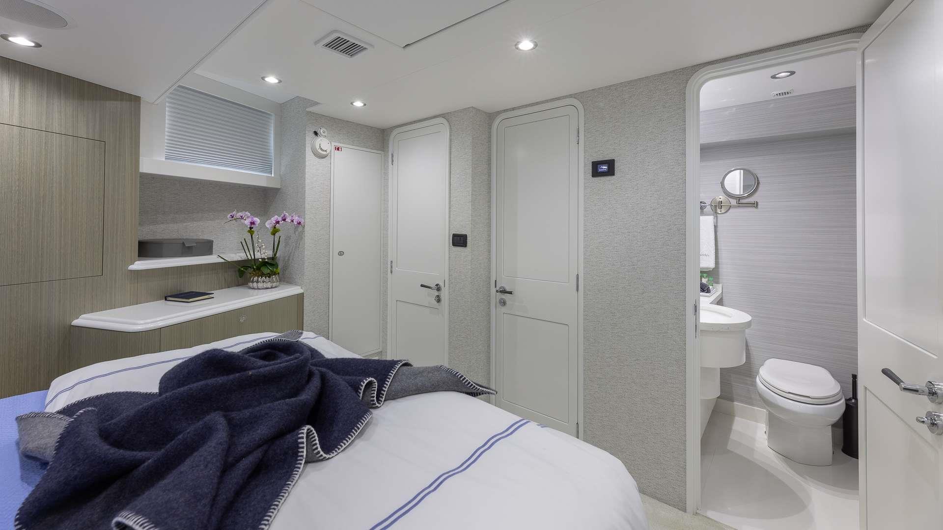 Starboard Guest Suite: Featuring a queen bed and an en suite shower, this suite includes a wardrobe locker and a 32" Samsung Flat Screen Television with smart tablet control.