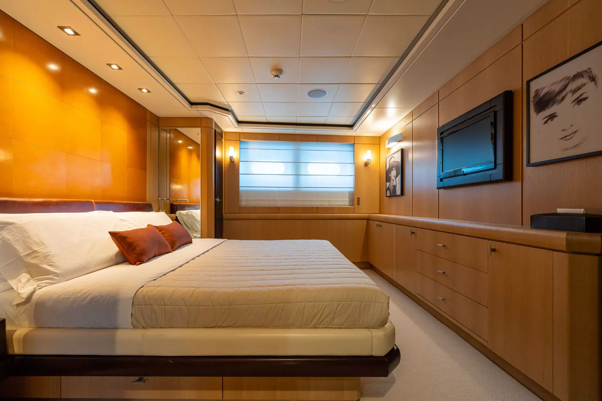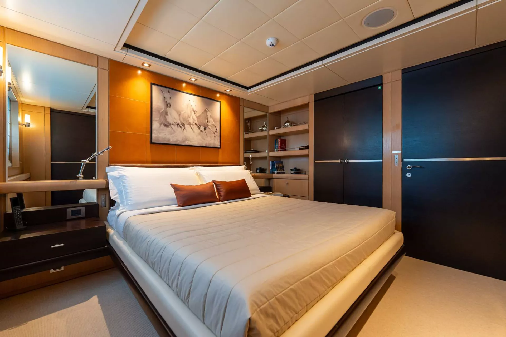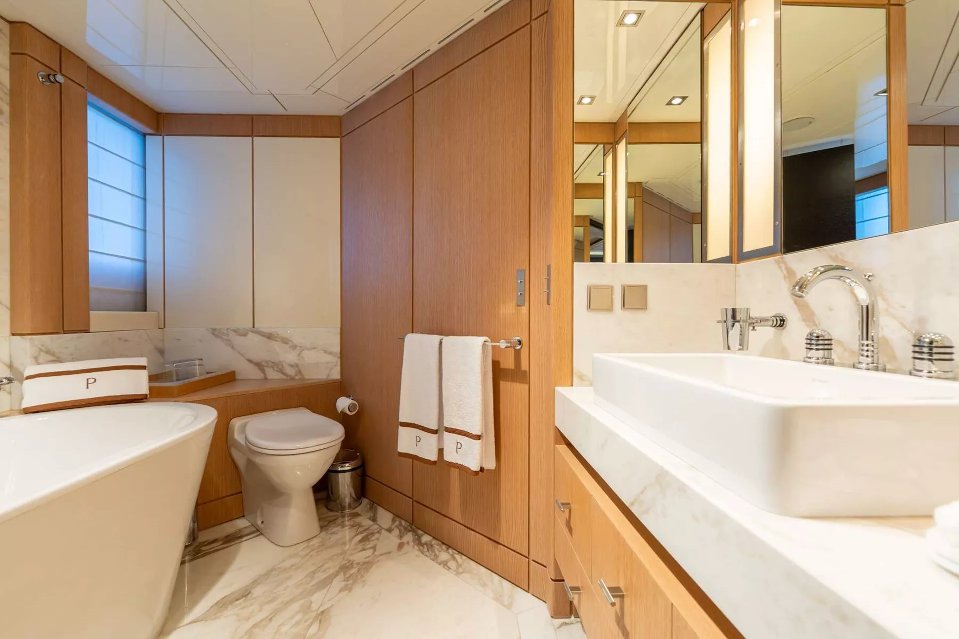 The full beam master cabin is located on the main deck and features 2 lavish marble bathrooms (one with shower, one with bathtub).