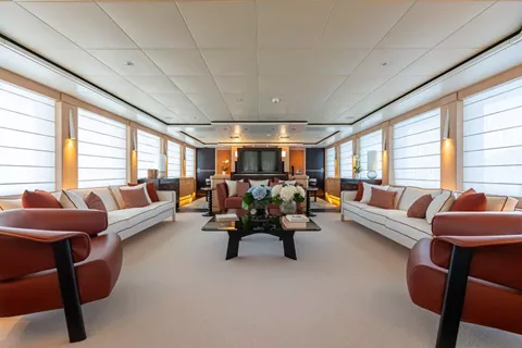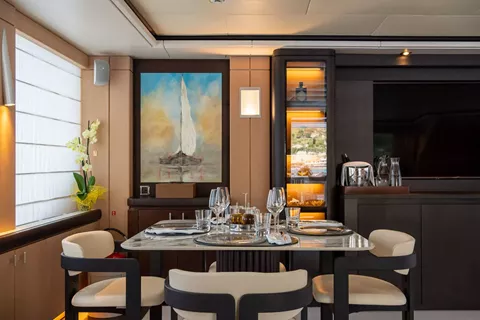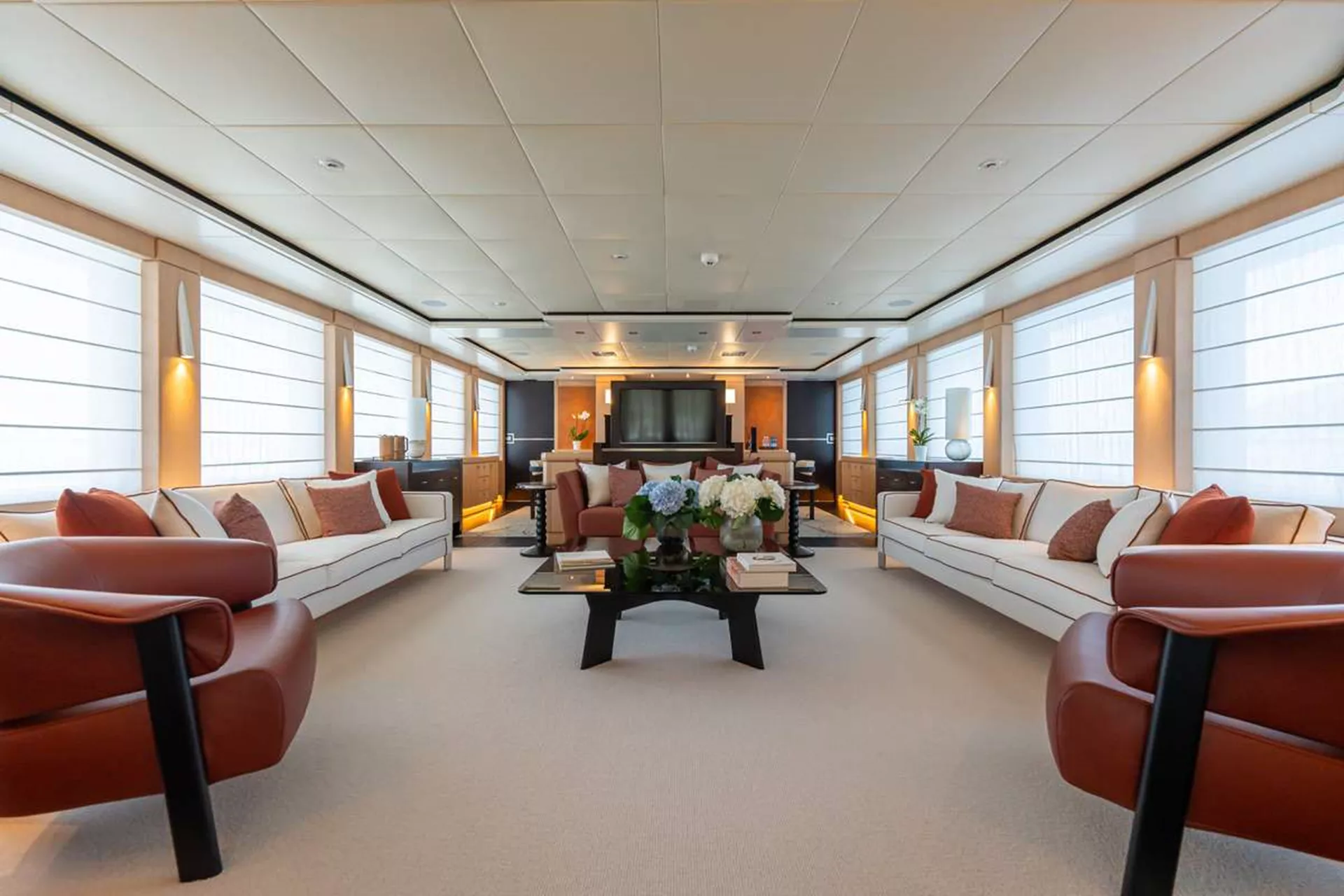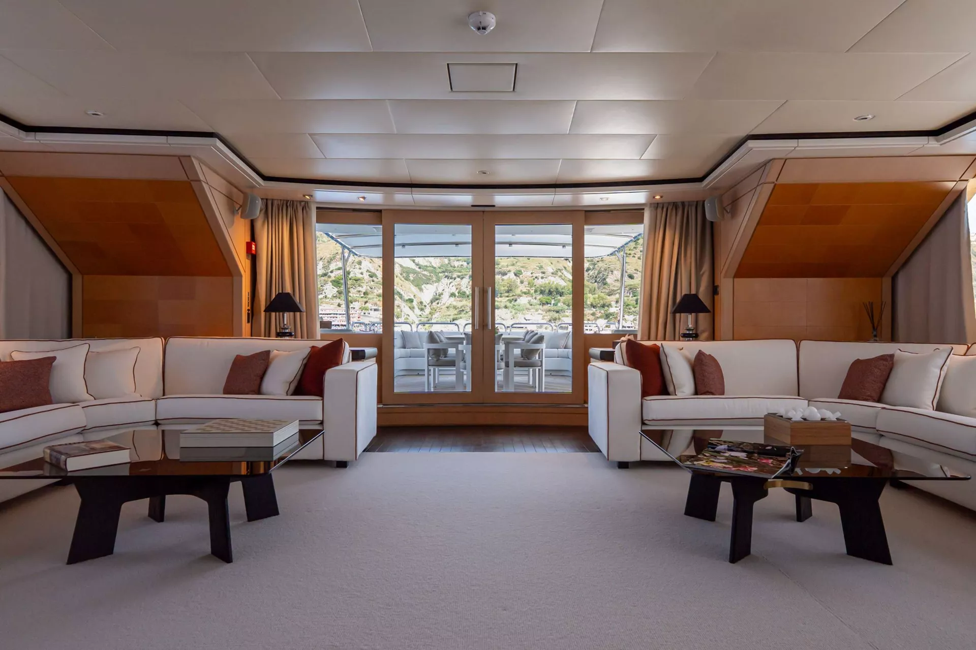 The spacious main saloon features an ample dining table and a generous aft lounge area.