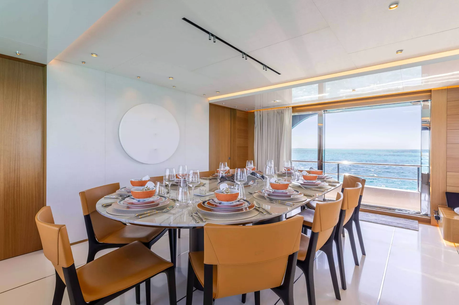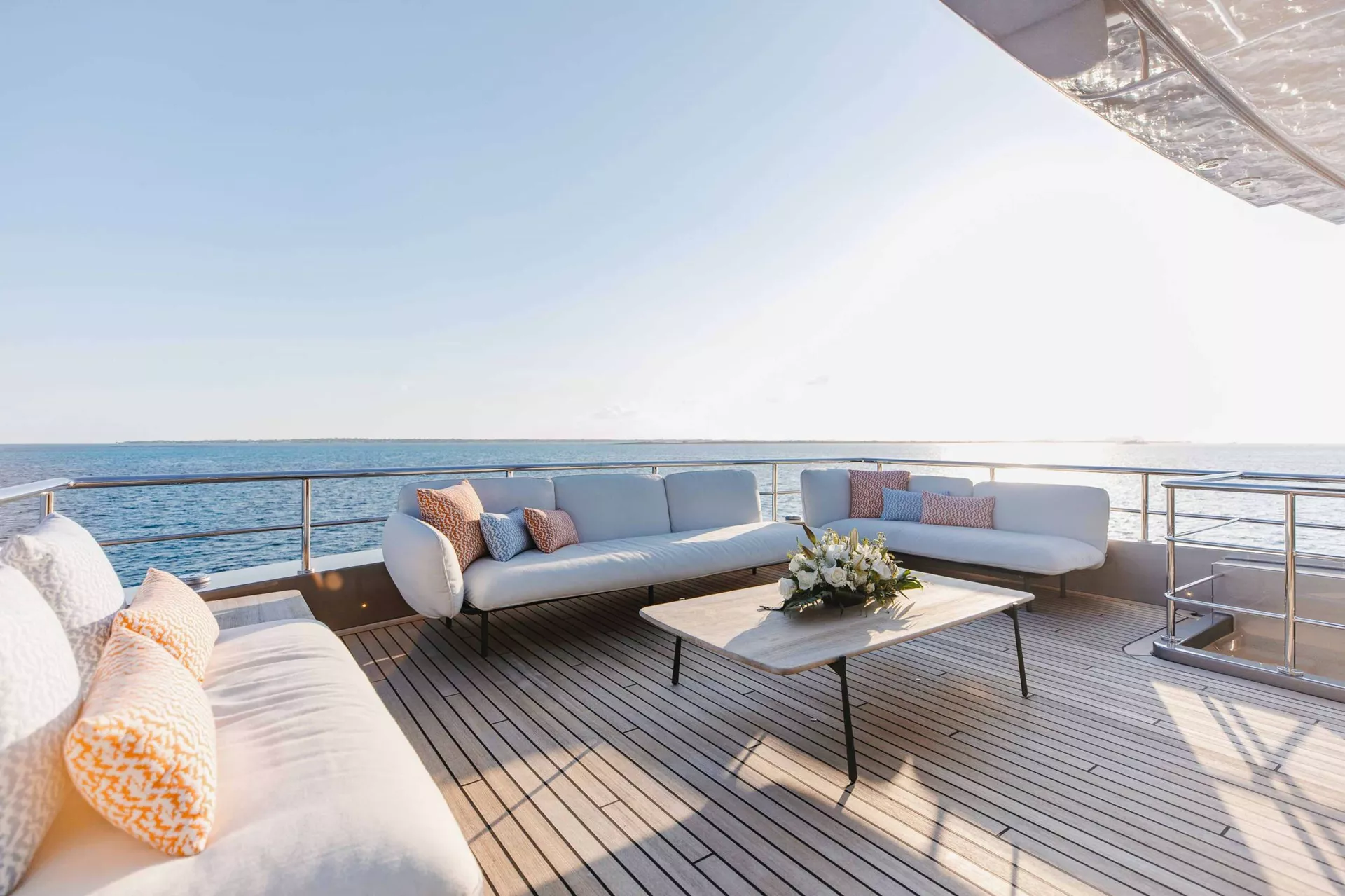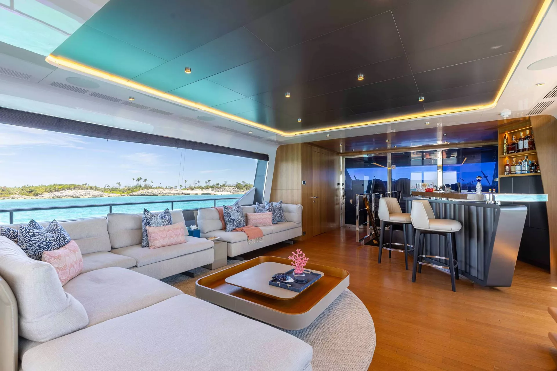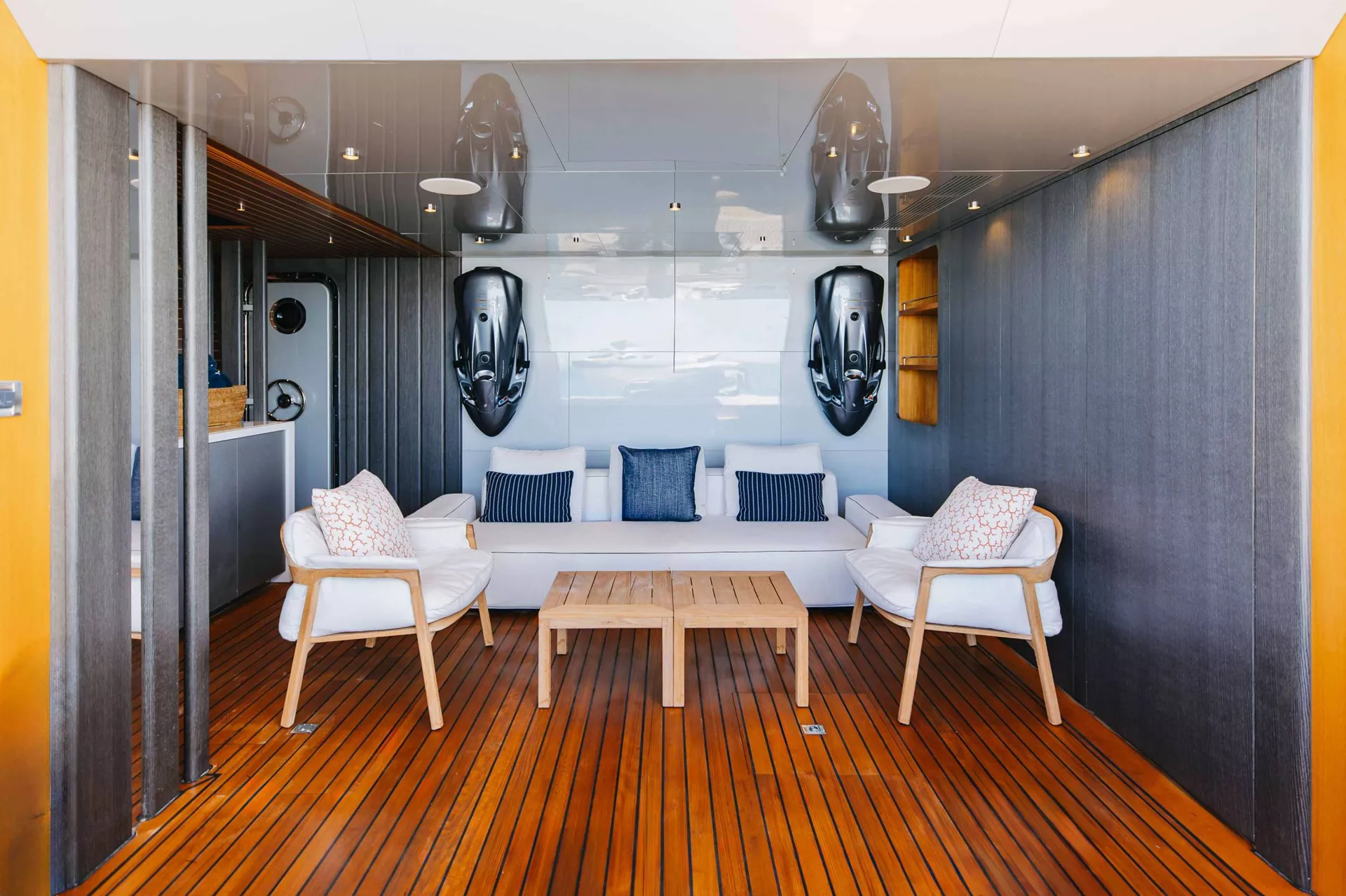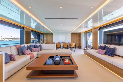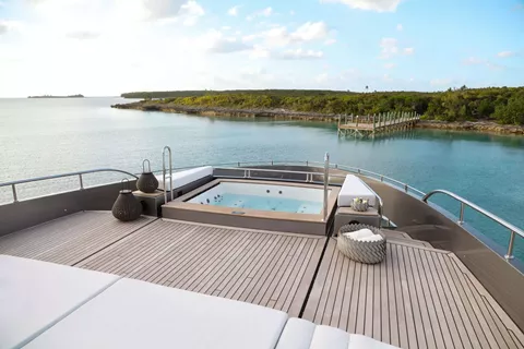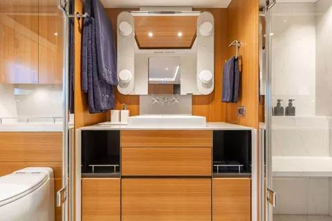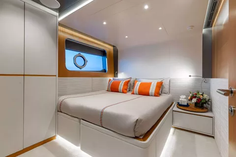 A SALT WEAPON hosts 5 staterooms to accommodate up to 10 guests. The master on the main deck features a King-sized bed, office space and his and her en sutie with adjoining shower. The remaining four staterooms are located below deck and comprise of 2 VIP's and 2 twin convertible staterooms, all with their own en suites.
