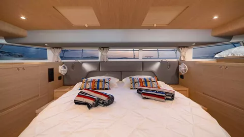 Aquila 54 "BY MY SIDE" is a 2024 power catamaran that can comfortably accommodate up to 8 guests in one master cabin and three double cabins, all with en-suite bathrooms. Built for both pleasure and performance, "BY MY SIDE" not only combines modern design with solid construction but also ensures a high level of efficiency and luxury.
