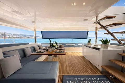 ROYAL DESTINY is a beautifully refitted Lagoon 620 catamaran offering generous space, refined comfort, and a vibrant onboard atmosphere. Accommodating up to 12 guests in 6 ensuite queen-bed cabins, she is ideal for families and groups seeking a relaxed yet luxurious yachting experience. With expansive indoor and outdoor living areas, modern entertainment systems, and an impressive selection of water toys, ROYAL DESTINY is perfectly suited for both relaxation and fun-filled days at sea.