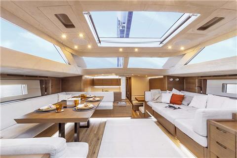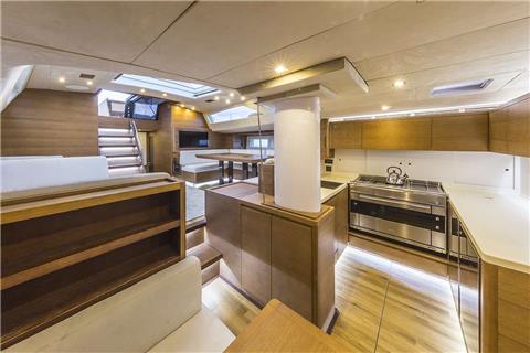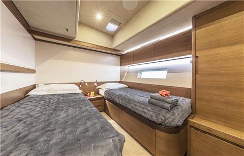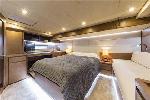 The owner’s suite aft with queen size bed, desk and sofa. The large en-suite toilet is made of two areas with separate shower.