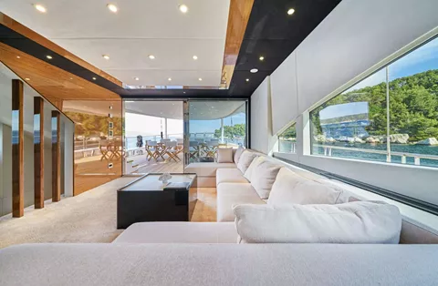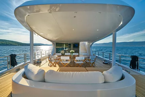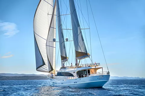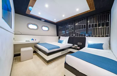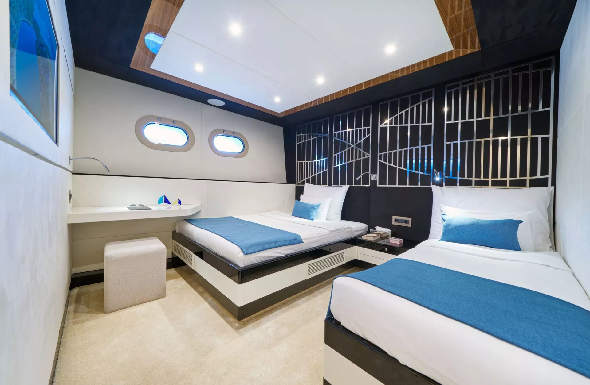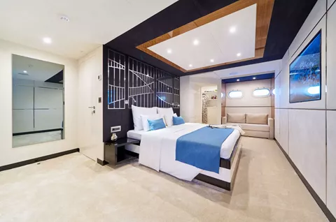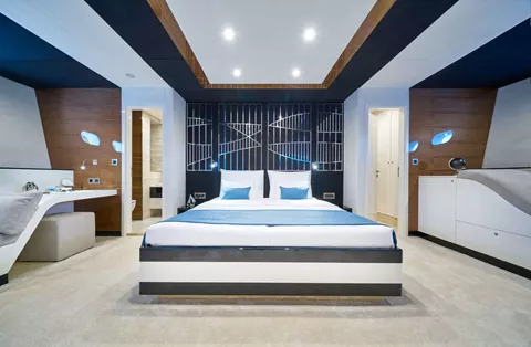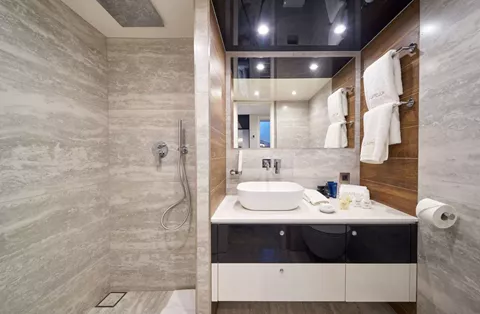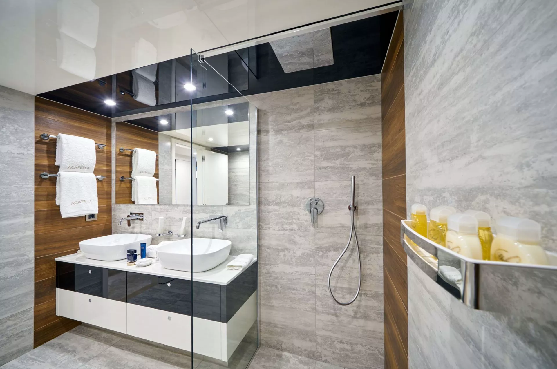 ACAPELLA provides accommodation for 12 guests in 5 cabins consisting of 3 magnificent full beam king sized cabins plus 2 cabins each containing a double bed + a single bed. Each cabin has a private ensuite bathroom, a safe box, TV and A/C controls.