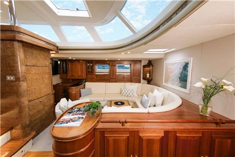 The aft deck serves as the perfect place for guests to unwind in the sun, with an optional Bimini when shade is required. There are C-shaped sofas either side and a large table for alfresco group dining and cocktails on an evening. The stern leads down to the swim platform, where the swim ladder grants easy access to the ocean.