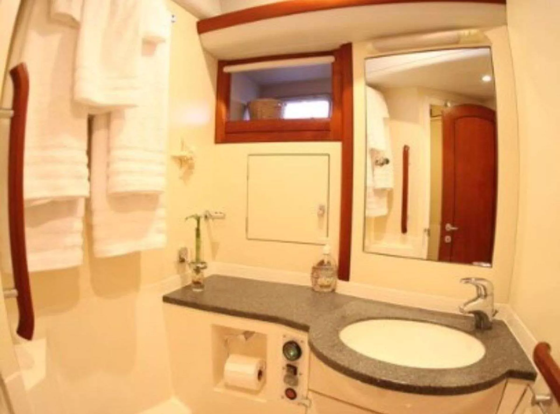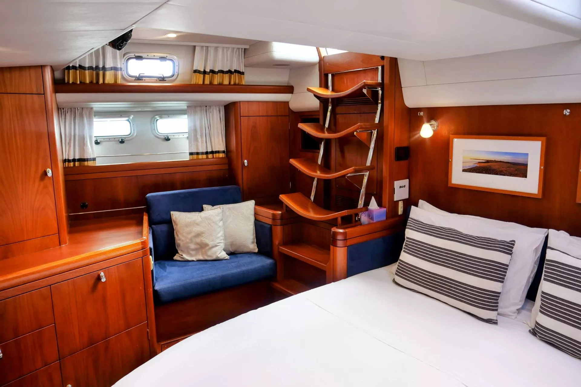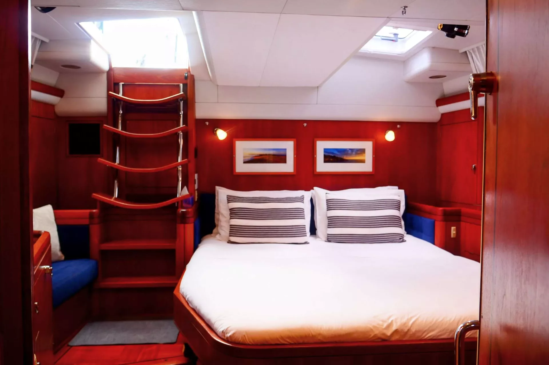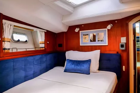 The mid-cabin on the port side has single beds in over/under bunk configuration. The mid-port cabin has an en-suite layout which is also accessible from the main corridor, so it can be used by guests as a day head. This cabin has a skylight hatch and multiple portholes with screen and blind covers, for ventilation by the cool sea breeze.