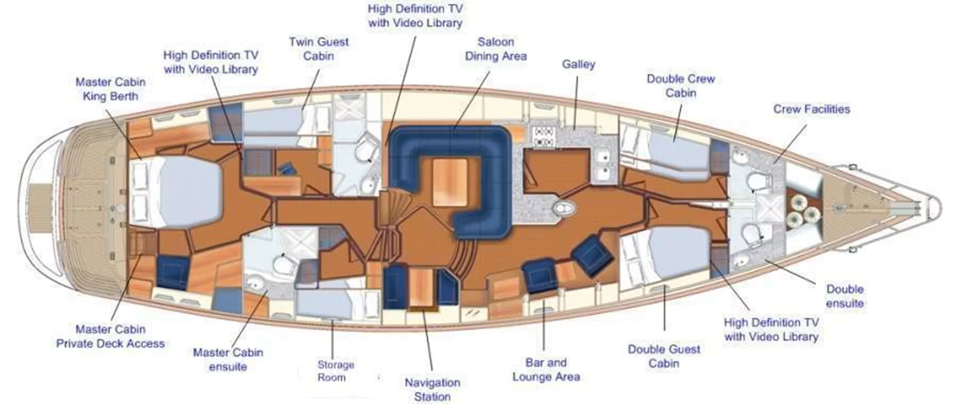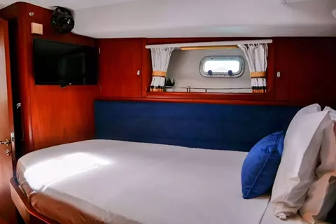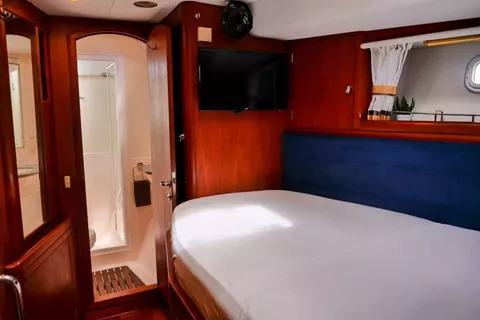 Elvis Magic has 3 guest cabins and boasts a spacious primary aft cabin with a king size bed and en-suite, which also has a private deck and entrance aft. This cabin has a small reading seat and a 20 inch flat screen TV. There is a double cabin in the starboard forward with a raised full-size bed, also with en-suite, along with a 20 inch flat screen TV.