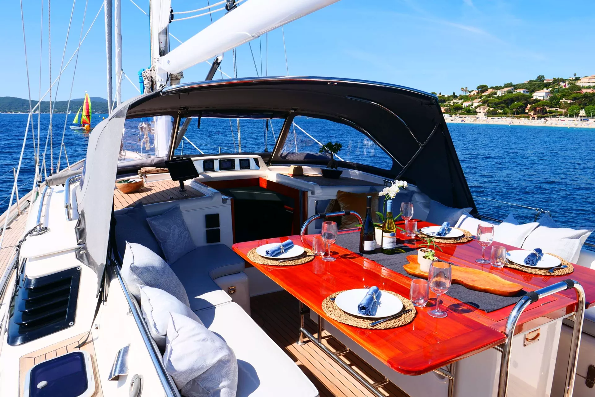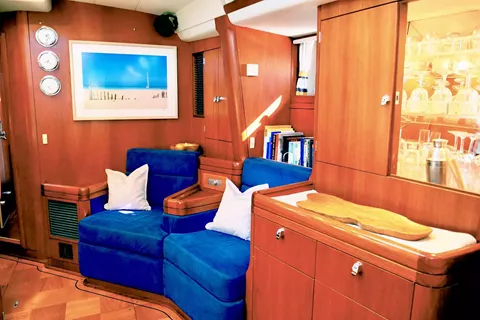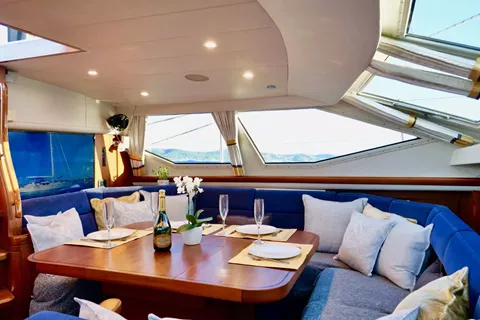 The spacious cockpit features a convertible dining table with built-in refrigeration, perfect for relaxed al fresco meals. Teak decks and a forward bow seat provide sunny spots for lounging or dolphin-watching as they surf your bow wave.