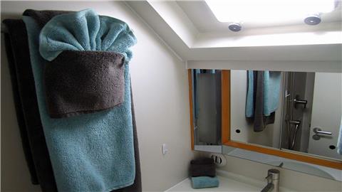 CAP II can accommodate 6 guests in three spacious double cabins (two forward and one midship) each with ensuite heads and cupboard space. The two forward cabins can be converted into a large primary suite due removable dividing wall that can form one large cabin.