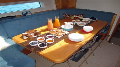 A performance cruiser, CAP II is more than a fantastic sailing yacht; she is luxurious and comfortable, and a joy to be aboard. She is operated from her aft cockpit, leaving the center cockpit for her guests to sun, sightsee and enjoy al fresco meals. A powerful sailing machine, CAP II is very stable, offering her guests a smooth, comfortable ride. Luxurious cruising accommodations aboard CAP II are for six guests in three well appointed double staterooms with ensuite bathrooms. You set the pace and itinerary aboard CAP II; your professional, courteous crew will do the rest.